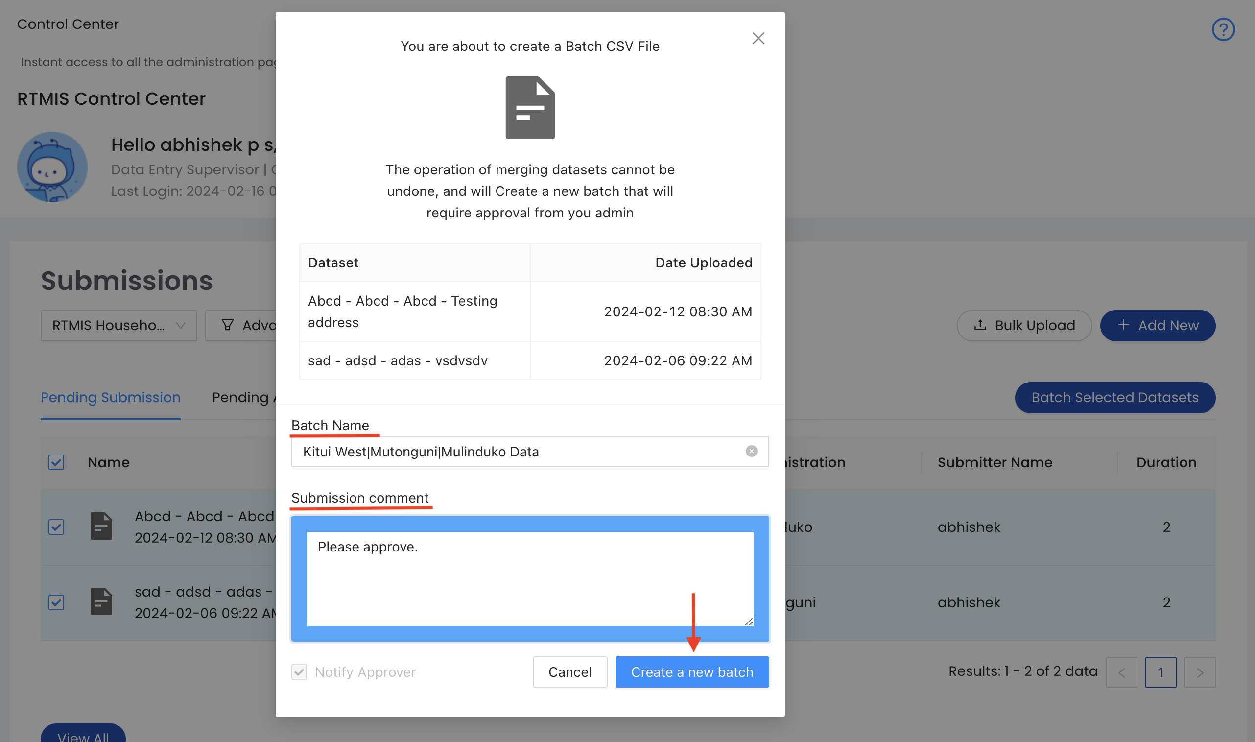 In the pop-up window, label your batch with a relevant name and add any comment for your approver. Next, click the CREATE A NEW BATCH button.