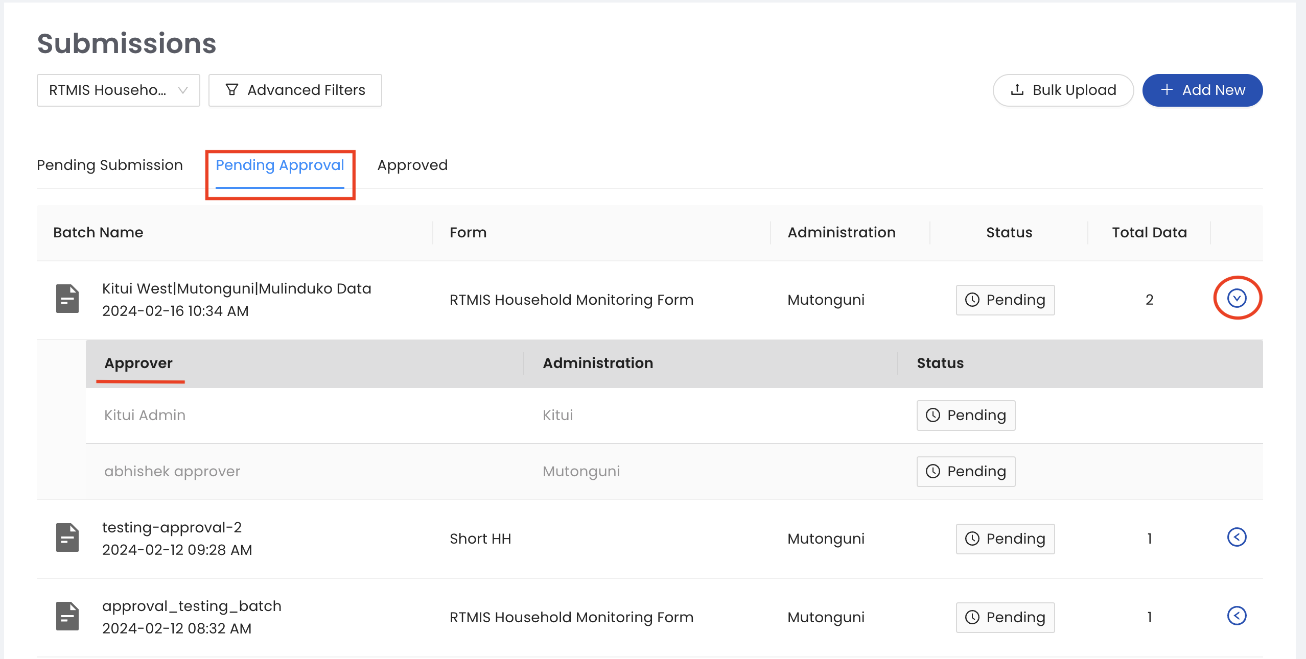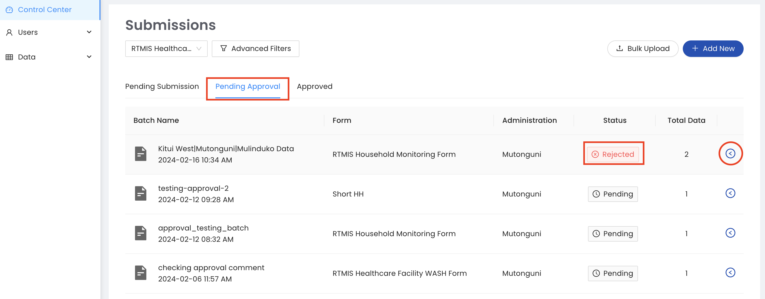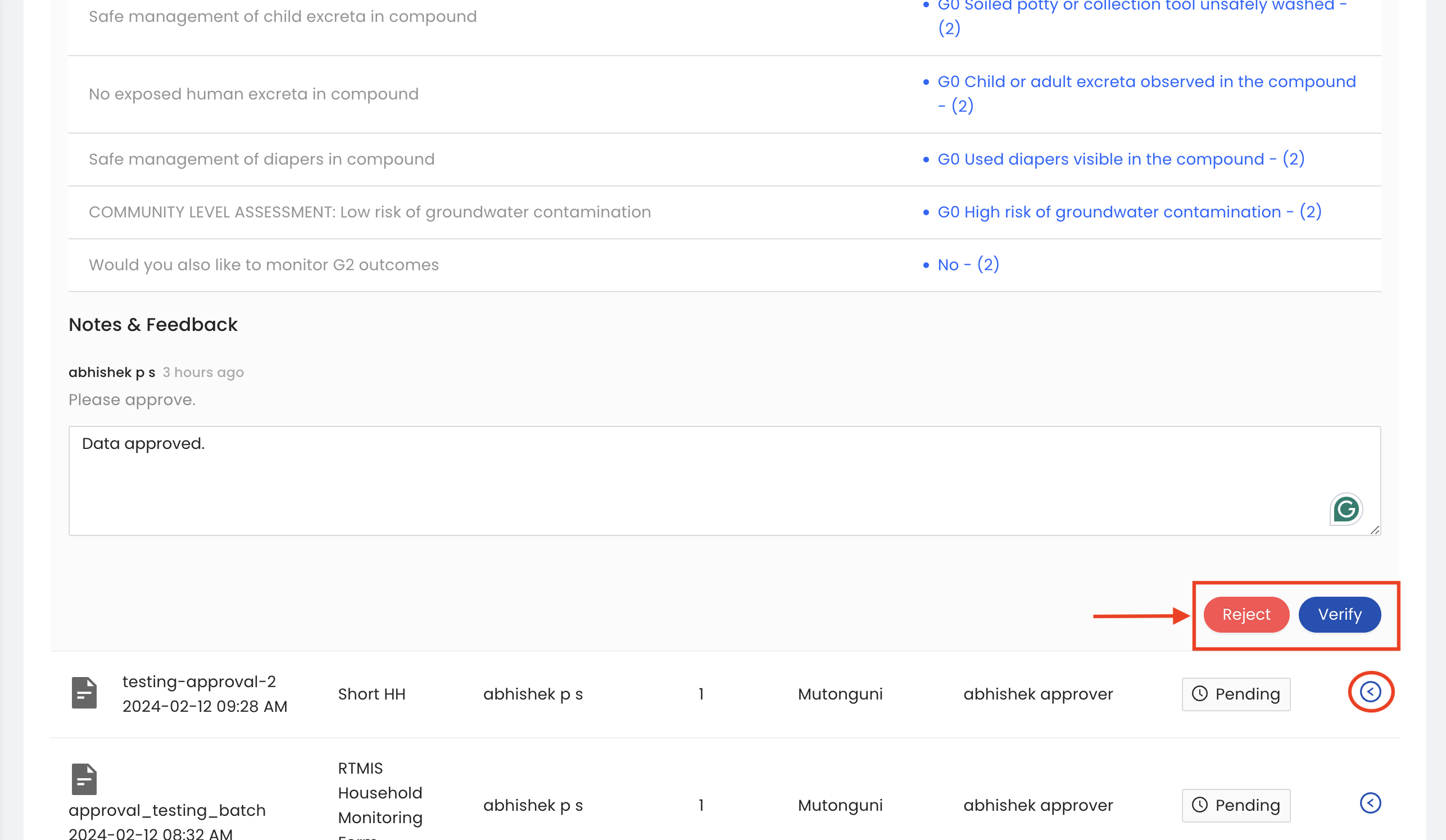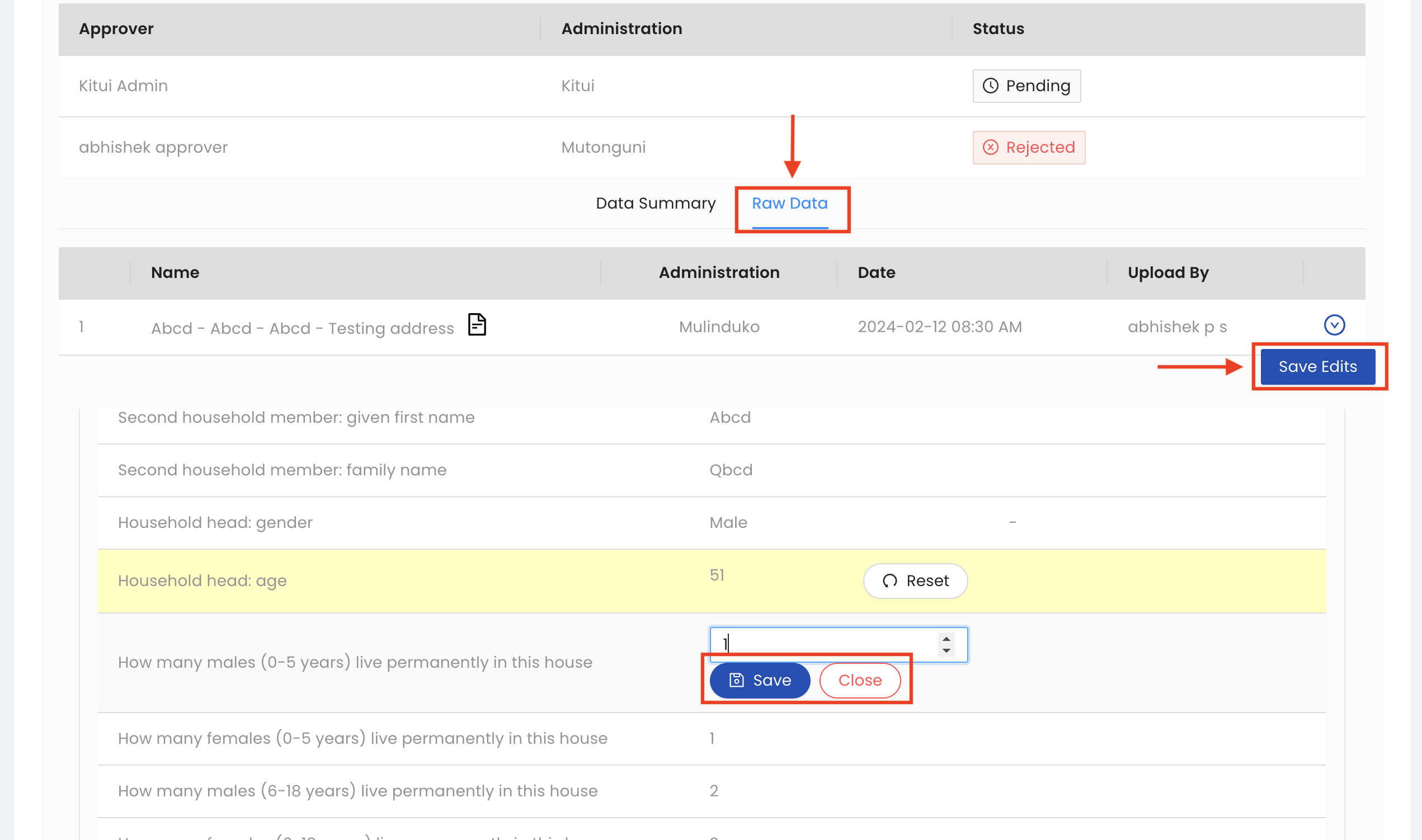 Rejected datasets will appear in the Pending Approval tab with the status Rejected:bolditalic:. Enumerators will receive an email notification when their data is rejected with an explanation from the approver why the data was rejected. Next, expand the toggle button next to the rejected dataset to make edits and resubmit your dataset.