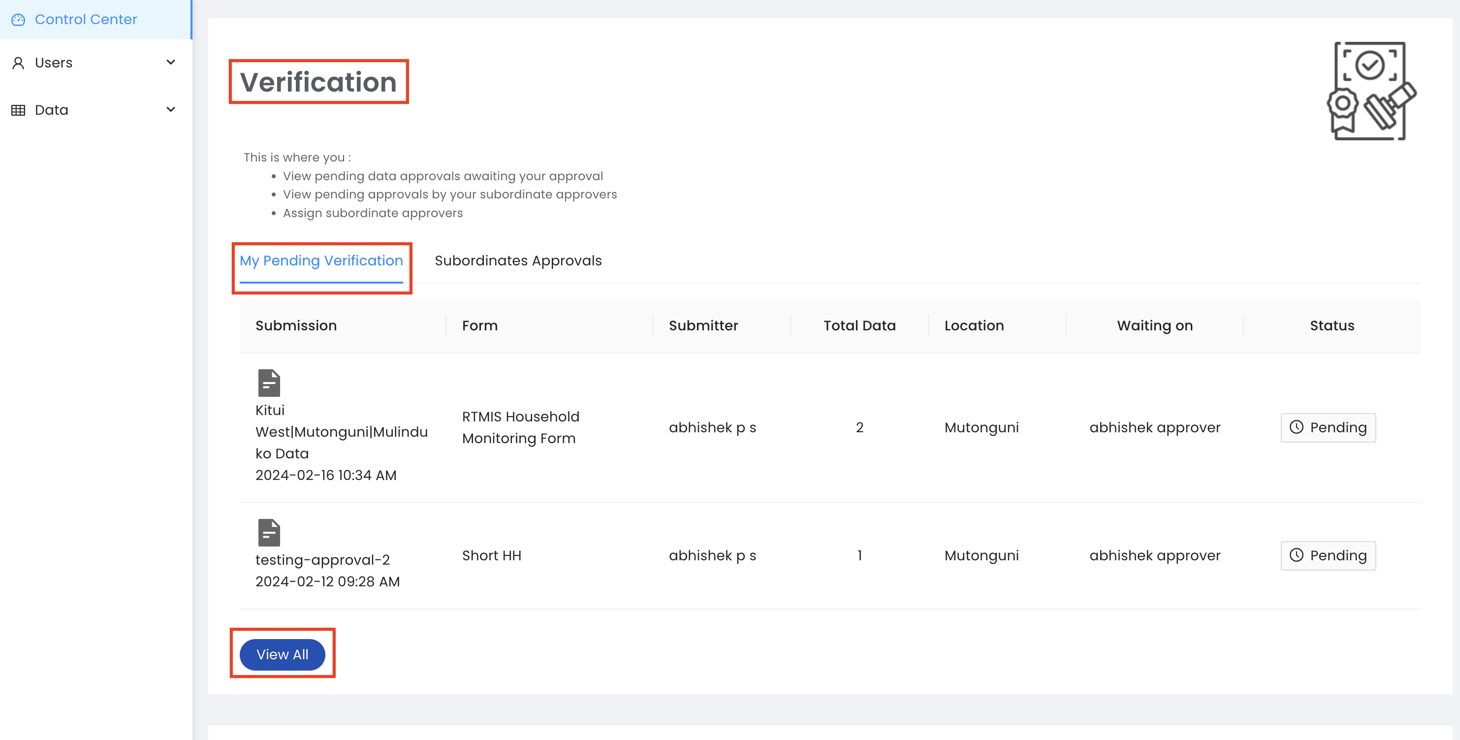 All datasets that are pending approval will appear in the Verification section of the Control center. Click the View All button to begin the approval process.